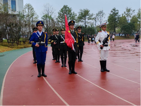 在细雨中,国旗护卫队的队员们踏着铿锵有力的步伐,庄严地护送着国旗迈向升旗台。随着雄壮激昂的国歌响起,五星红旗在晨光中缓缓升起,迎风飘扬。
