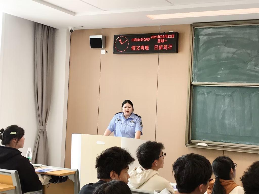 本次班会由班主任胡勤老师组织策划,大二员工干部沈俊怡主持,党总支副书记李启文老师和辅导员尹帆老师列席活动,并特邀荆州区公安局刑侦大队情报信息中队中队长吴晓兰警官和中队民警徐付蝶警官作为嘉宾。