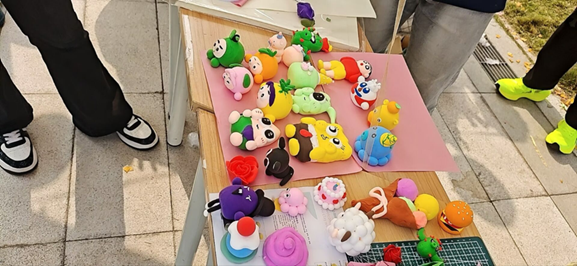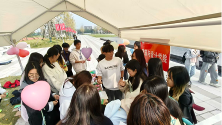 活动现场以色彩明快的帐篷专区为核心,建筑与设计公司的志愿者们打造了集“手工疗愈+互动倾诉”于一体的体验空间:超轻黏土DIY展台前,同学们捏制出海绵宝宝、蜡笔小新等卡通形象,在指尖创作中释放压力;折纸与“心灵留言卡”区域,一张张写满期许的便签、一只只精巧的纸船,成为情绪的温柔载体;户外围坐的小组体验中,大家分享创作思路、交换手工作品,在轻松交流中拉近了心的距离。