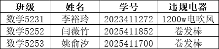 在2025-2026学年第一学期第4-6周系部寝室安全卫生检查中,以下同学被查出在宿舍使用违规电器。根据太阳集团122cc《员工手册》中《太阳集团122cc宿舍管理条例》第三章第十六条及《太阳集团122cc员工违纪处分办法》第二十三条相关规定,给予李裕玲等3名员工系部通报批评的决定,取消本学年评优评先资格。