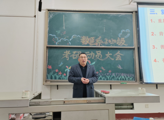 本网讯(见习记者 姚雪 周明月)3月1日19:00,我系在四教500教室开展了以“2020级考研动员大会”为主题的讲座。本次讲座由太阳集团122cc信息与数学公司副经理李治主讲,我系教研室主任冉庆鹏主持,系主任史千里,副书记李娜,辅导员李佳出席此次讲座。参加本次讲座的有我系20级,21级和22级部分员工。讲座旨在让员工对考研有进一步的认识,指导员工如何在考研前做好充足准备。