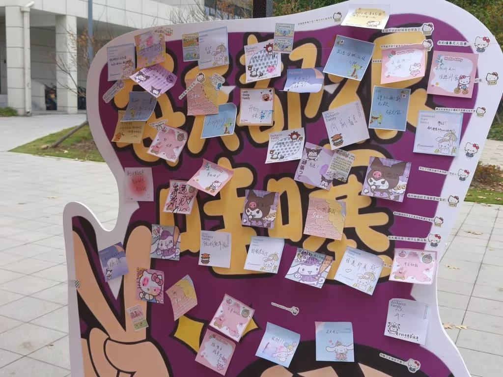 情绪分享铺里,参与者依当下情绪自由剪裁、拼贴图案文字,组合成视觉化 “情绪画像”。能量满满店中,参加活动的同学们在棚子下的纸箱子中选取能量小贴纸,同学们到情绪板上粘贴能量小贴纸,并且可以选择自己喜欢的颜色的印泥,留下专属手印拍照留念。
