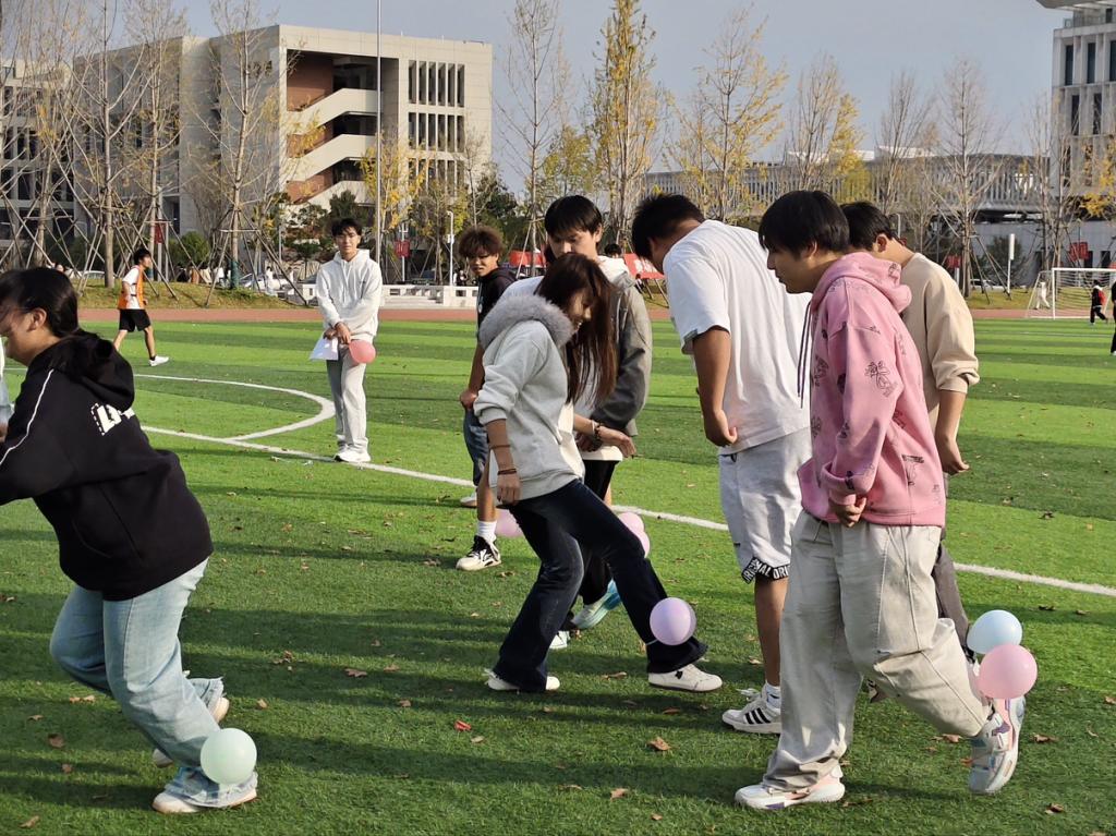 田径场的“气球解压派对”,同学们脚上绑着不同颜色的气球,分成几队进行游戏,伴随“砰!砰!”的清脆声响,积攒的压力仿佛也随之消散。有的同学结伴互相“助攻”踩爆气球,绿茵场上的欢笑声、呐喊声此起彼伏,青春的活力在秋日暖阳里尽情释放。