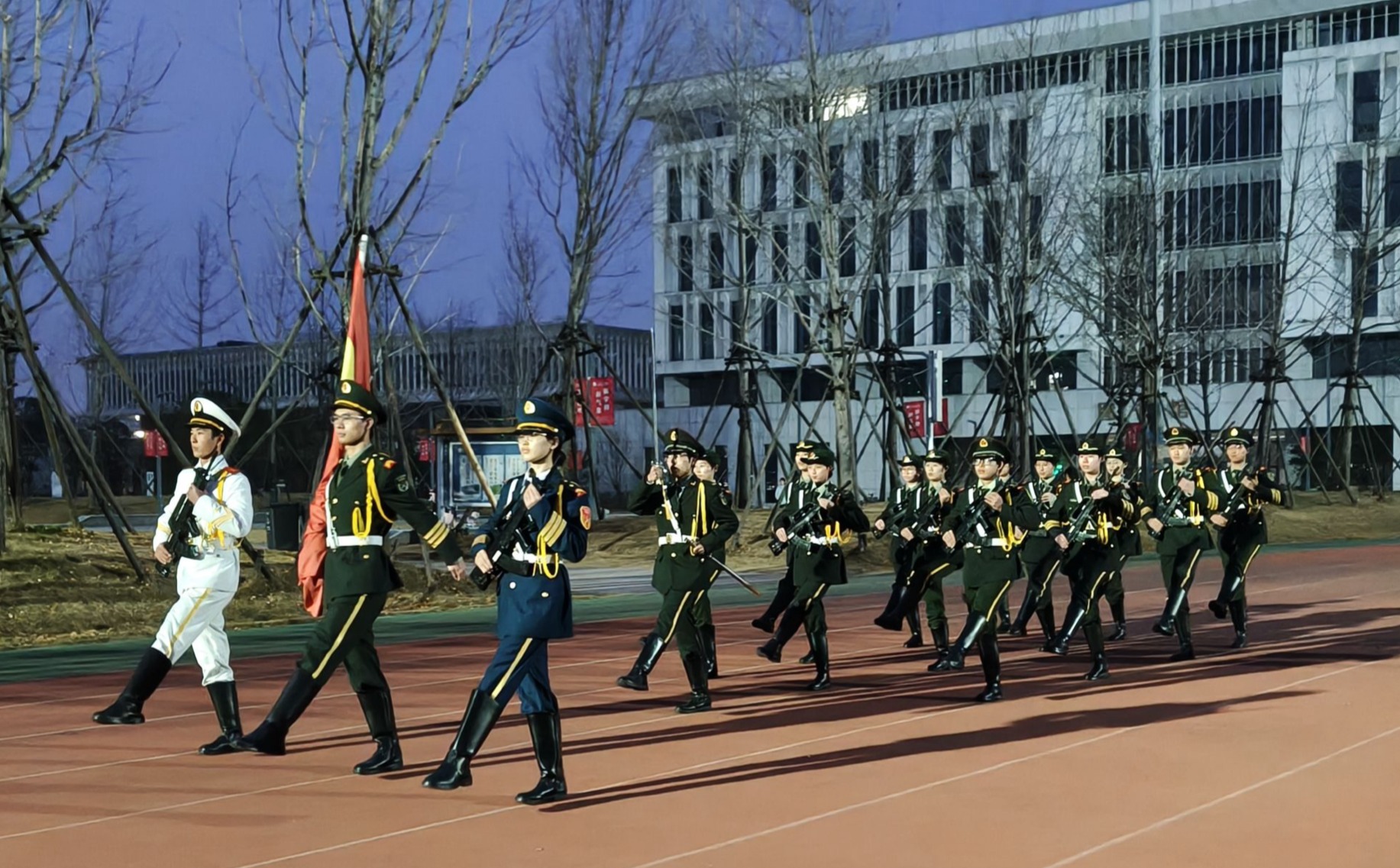 上午,升旗仪式正式开始。护旗队队员迈着整齐划一的步伐,昂首挺胸护送五星红旗入场。在全场师生的注目下,五星红旗冉冉升起,迎风飘扬。全体人员肃立致敬,齐唱国歌,爱国之情与奋斗之志在每个人心中激荡。