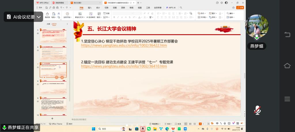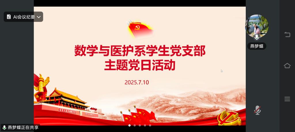 本网讯(通讯员 崔润芳)7月10日19:30,数医系员工党支部在腾讯会议开展7月份支部“主题党日”活动,活动由数学与医护系员工党支部书记燕梦蝶主持,支部全体党员参加。