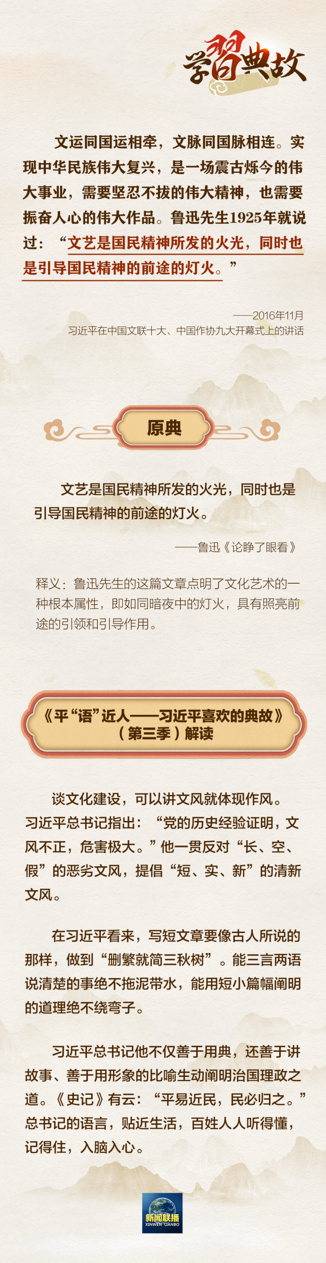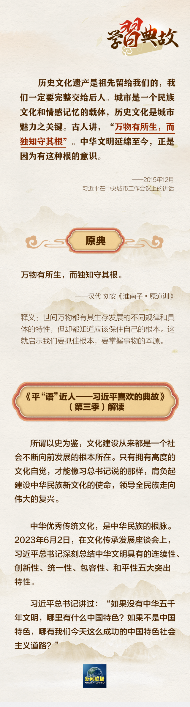 文运同国运相牵,文脉同国脉相连。文化自信是一个国家、一个民族发展中,最基本、最深沉、最持久的力量。党的二十大报告中指出:“全面建设社会主义现代化国家,必须坚持中国特色社会主义文化发展道路。”围绕“文化建设”这一主题,总书记曾讲到哪些典故?一起学习↓↓↓