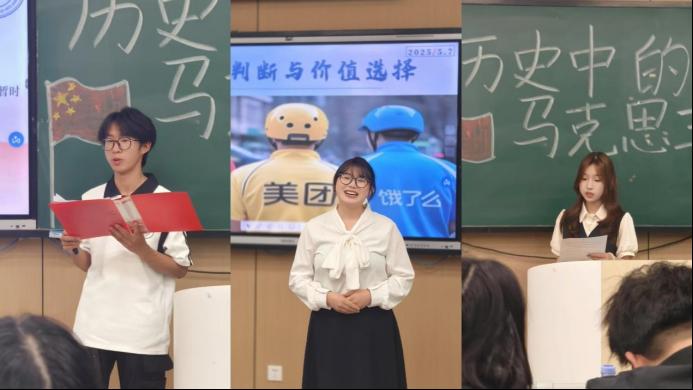 决赛现场,来自马克思主义公司的三位专业评委老师史苗苗、李晶晶、丁风岭从教学设计、理论深度、表达逻辑等维度进行专业点评。选手们展现稳健台风与扎实理论功底,创新性融合传统文化与马克思主义理论,辅以制作精良的PPT课件。评委组建议需强化历史语境分析,避免教条化倾向,同时注重PPT内容的结构化呈现。