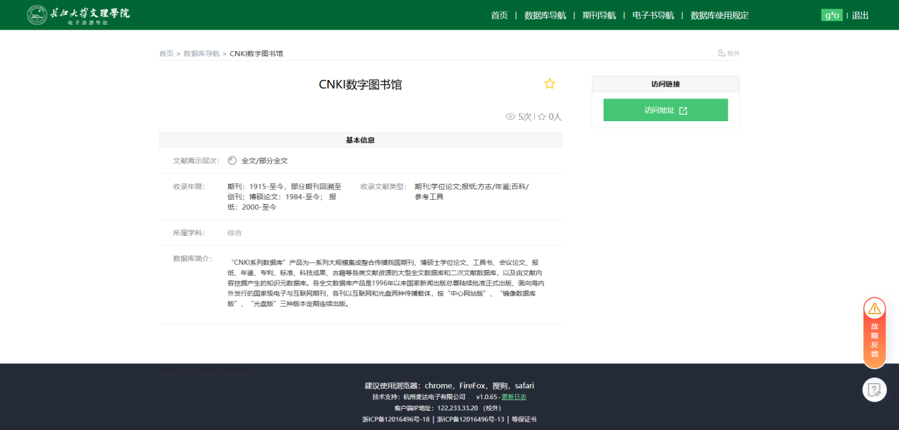 点击一个数据库,进入数据库详情页。博采电子资源管理平台提供数据库基础信息、等内容。点击右上角五角星,即可关注数据库。