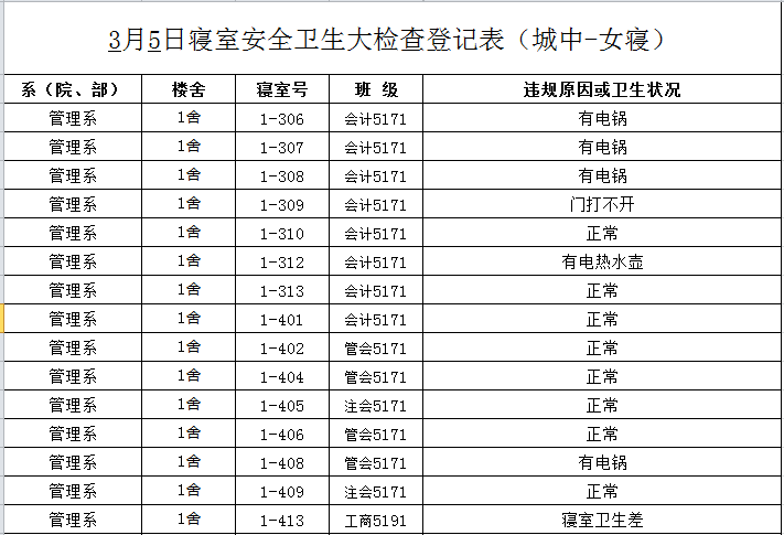 2020-2021学年第二学期第1周寝室检查结果通报
