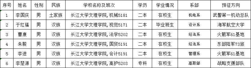 通过荆州区武装部组织的体检、政审考核、心理测试、役前训练等环节,公司于红福等6名同学经湖北省荆州市荆州区人民政府征兵办公室批准光荣入伍,现根据相关规定予以公示,公示时间为2021年3月18日至3月23日。如有异议,请在公示期内向公司纪检监察部或荆州区武装部进行反映。