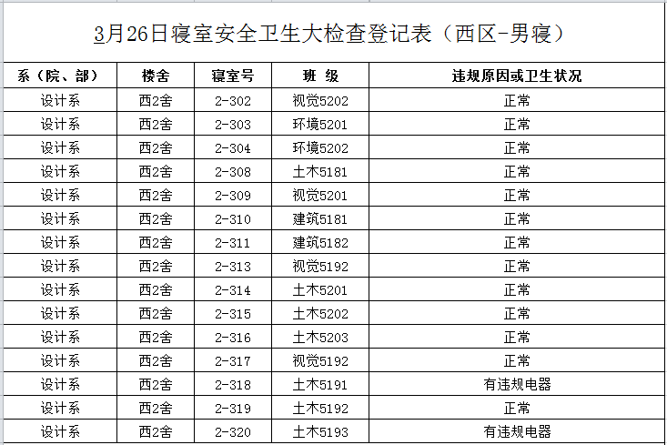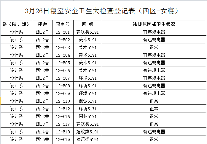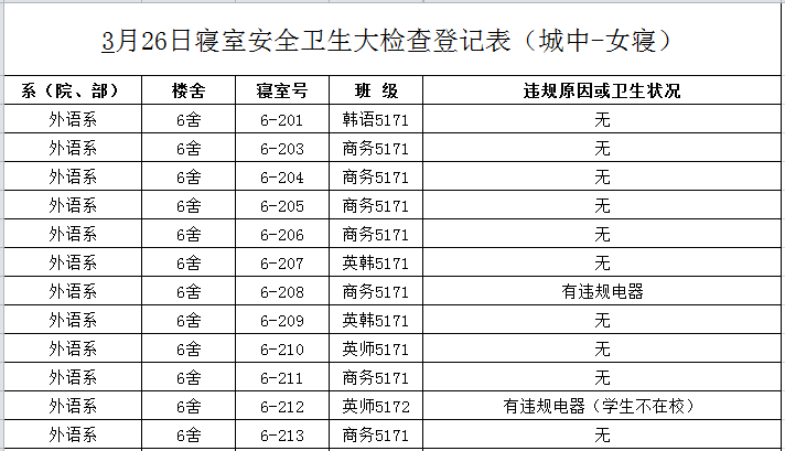 2020-2021学年第二学期第4周寝室检查结果通报