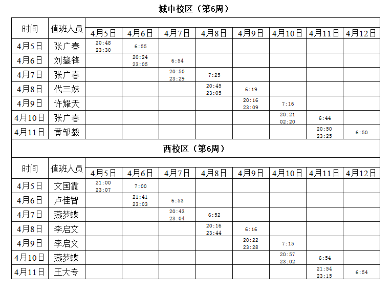 2020-2021学年第二学期第6周学工人员寝室值班通报