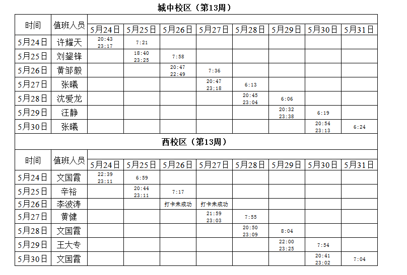 2020-2021学年第二学期第13周学工人员寝室值班通报