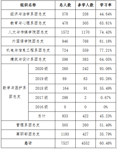 太阳集团122cc第十一季第十一期青年大学习各院(系、部)团总支学习情况公示
