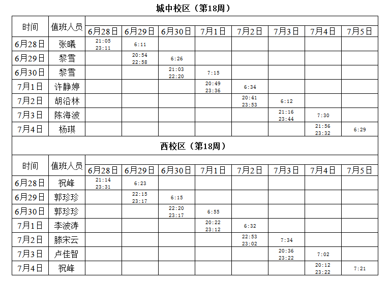 2020-2021学年第二学期第18-19周学工人员寝室值班通报