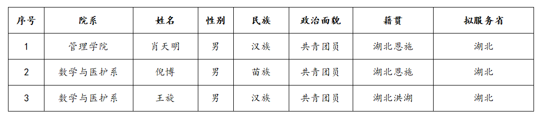 为做好2024—2025年度老员工志愿服务西部计划志愿者招募选拔工作,根据西部计划湖北省项目办招募方案要求,本着“公平、公正、公开”的原则,结合公司工作实际,在自愿报名、资格审查、笔试、面试等环节的基础上,拟增补以下3名毕业生为2024—2025年度老员工志愿服务西部计划志愿者,现将名单予以公示: