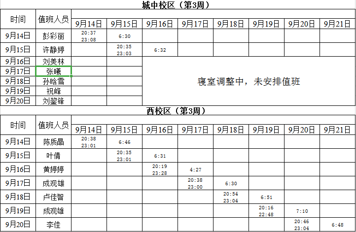 2020-2021学年第一学期第3周学工人员寝室值班通报