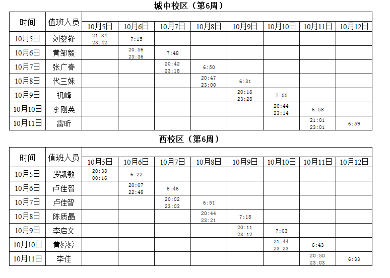 2020-2021学年第一学期第6周学工人员寝室值班通报