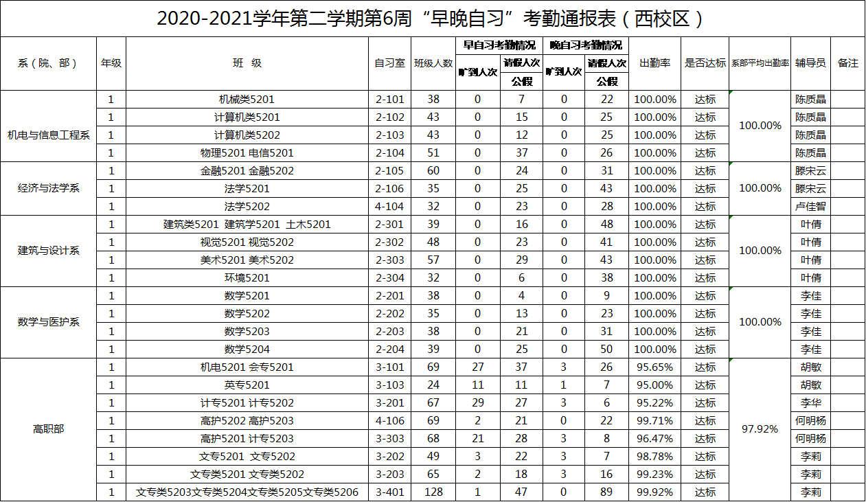 2020-2021学年第二学期第6周系(院、部)早晚自习考勤通报