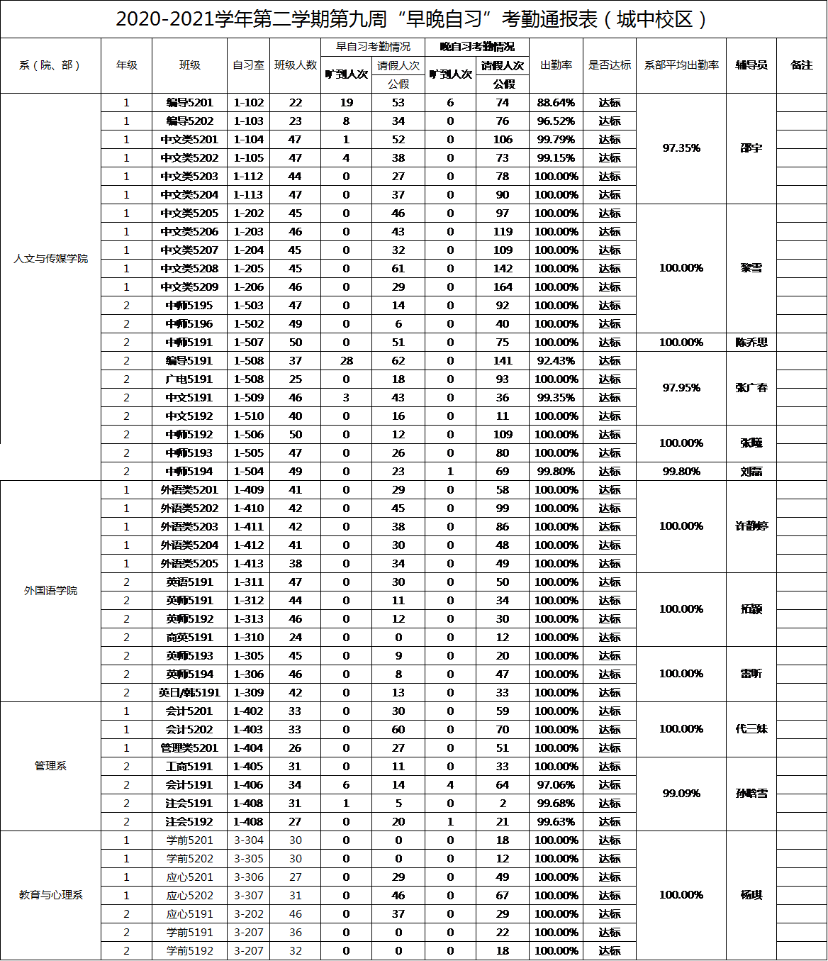 2020-2021学年第二学期第9周系(院、部)早晚自习考勤通报