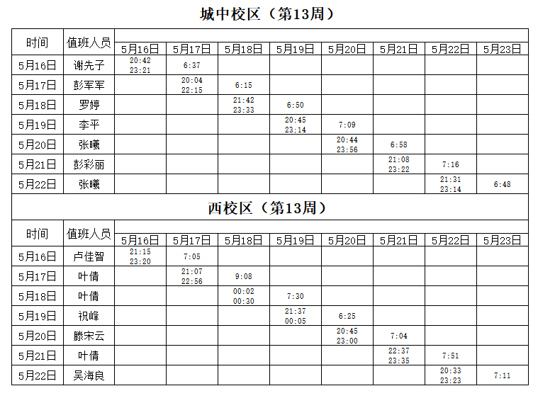2021-2022学年第2学期第13周学工人员寝室值班通报