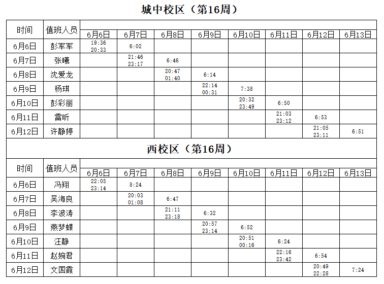 2021-2022学年第2学期第16周学工人员寝室值班通报