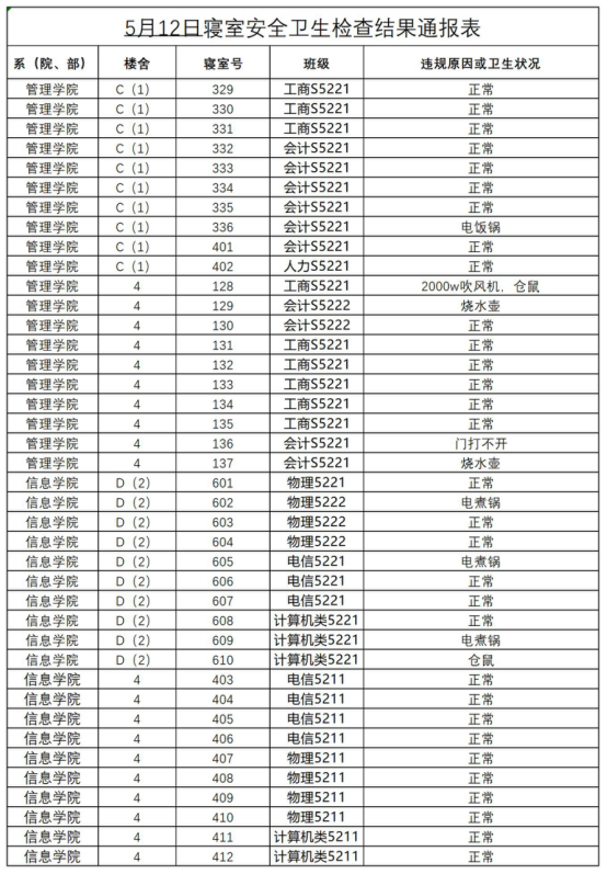 2022-2023学年第二学期第十三周寝室安全卫生检查结果通报