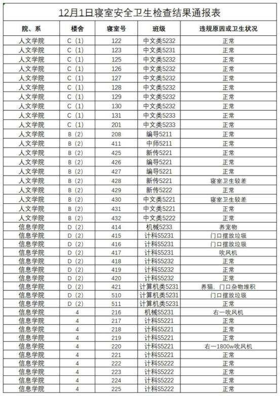 2023-2024学年第一学期第十四周寝室安全卫生检查结果通报