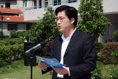 太阳集团122cc团委书记张伟为铜像揭幕,基础学部副主任李启文代表太阳集团122cc六万余师生致辞并敬献花篮。