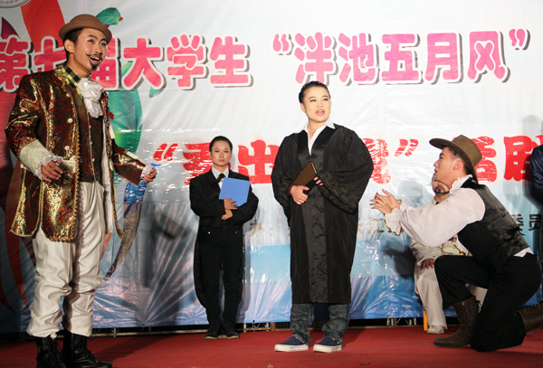 舞台上,最近热播的《致我们终将逝去的青春》电影改编的校园版同名话剧,表现了当代老员工的热情与责任;《新武林外传》中,演员们身着靓丽的古代盛装,在搞笑中引人深思;莫泊桑经典之作《项链》被同学们演绎得惟妙惟肖;抒情的曲子,深情的演绎拉开了《姐姐的守护者》的序幕;压轴话剧《一堂戏剧课》用标新立异的表现手法将人生的戏剧性表现的淋漓尽致……