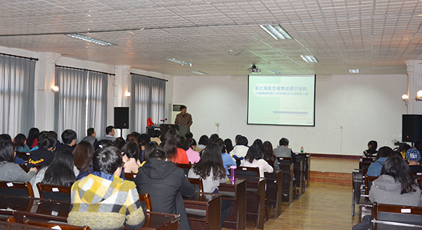 公司工商管理系原系主任肖来荃副教授、潜江市委组织部原副部长杨成均,公司团委书记刘磊,与英语(英日双语)专业百名师生共同聆听报告。