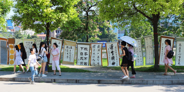 本网讯 6月16日,公司举办“行云流水绘丹青”书法展,共展出师生书法作品37幅,涉及行书、楷书、隶书等字体。本次展览由院团委主办,书画协会承办,展览为期三天。(见习记者 彭念 熊姿/文 胡秉昶/摄)