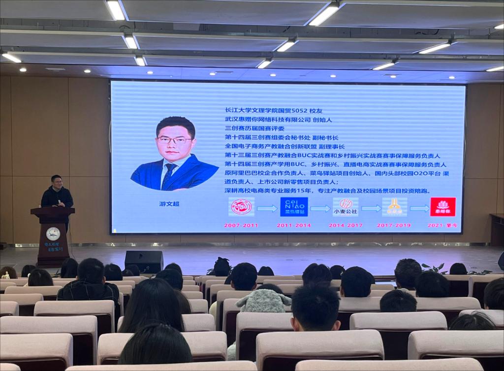 为深化校企合作,推进产教融合,扩宽员工参赛视野,员工工作部邀请公司优秀员工——武汉惠赠你网络科技有限公司创始人游文超来院,为同学们举办了一场别开生面地交流会。游文超以“创新、创意及创业”大赛 加速产教深度融合为主题,从个人的创业经历出发,如何结合市场,实现以在校参赛、毕业即就业的成功路径,为同学们指明了大学四年的清晰规划。