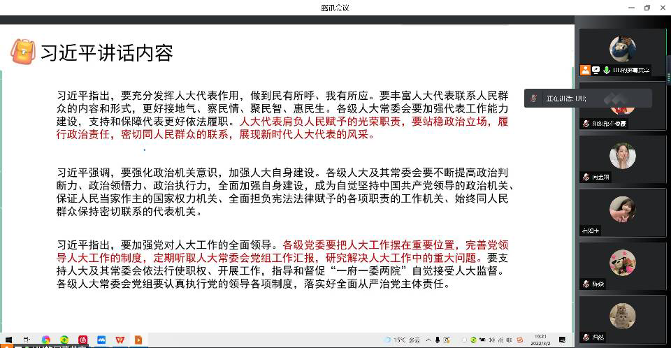 团课中,虽然同学没能聚在一起学习这堂主题团课,但依旧不减同学们的积极和热心,同学们在线上“云视频”的科技交互下,使本次团课更加生动活跃。各班同学在团支书的带领下,通过讲述,观影习总书记讲话片段,互动问答等新颖的形式,了解本次团课的意义。各院(系,部)团课内容丰富,形式多样,氛围活跃。员工们参与度高,让员工们在轻松愉悦的团课中学习党中央统筹中华民族伟大复兴战略全局和世界百年未有之大变局,从坚持和完善党的领导、巩固中国特色社会主义制度的战略高度出发,继续推进人民代表大会制度理论和实践创新,提出的一系列新理念新思想新要求。增强中国青年使命感,责任感。