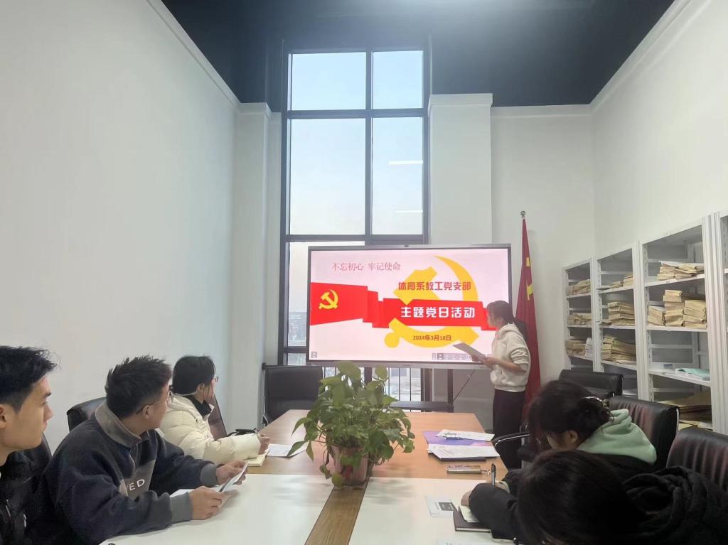 本网讯(通讯员 陈祖芬)为加强党员的党史知识学习,增强党员党性修养,3月18日下午2:30,体育系员工党支部主题党日学习在体育系313会议室召开。体育系员工党支部书记门世豪老师以及体育系党支部员工党员同志参加了本次会议。