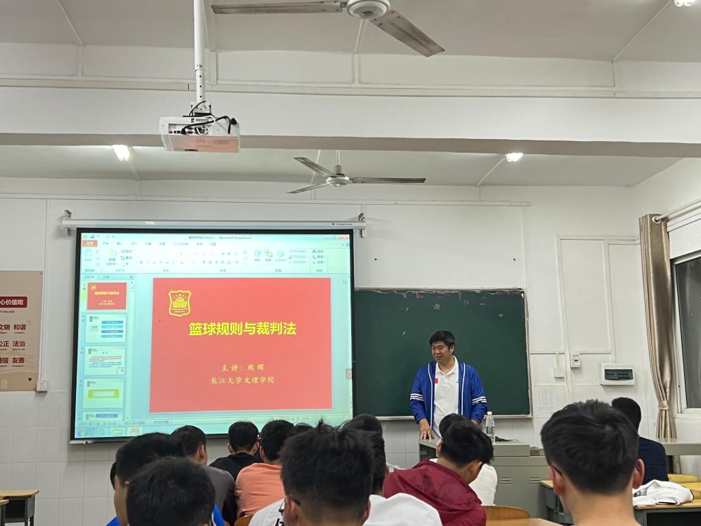 本网讯(通讯员 姚立)5月17日晚,在西校区4教进行了第十八届“文理杯”篮球赛的裁判员培训。主讲人是本次赛事的裁判长熊辉老师。体育系主任介博和全体教师、员工裁判员参加了本次培训。