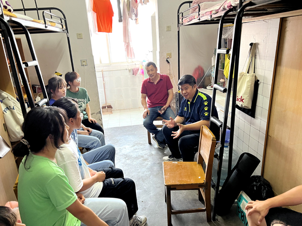 在风华园3栋114寝室,曹骥和体育系相关负责人认真听取了同学们关于校区搬迁、员工活动、课程设置、专业实习的困惑,并一一进行了解释,提醒同学们暑期要注意安全,增强个人防护意识,保持身心健康。体育教育专业的杜习申对员工每天出早操的必要性提出了疑问,系主任介博对此进行了解释,并对下学期体育教育专业的课程设置进行了解读,杜习申和同学们纷纷点头表示理解。