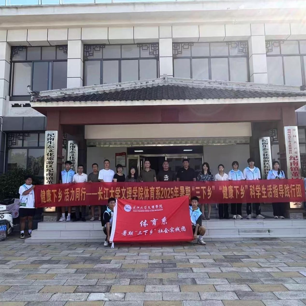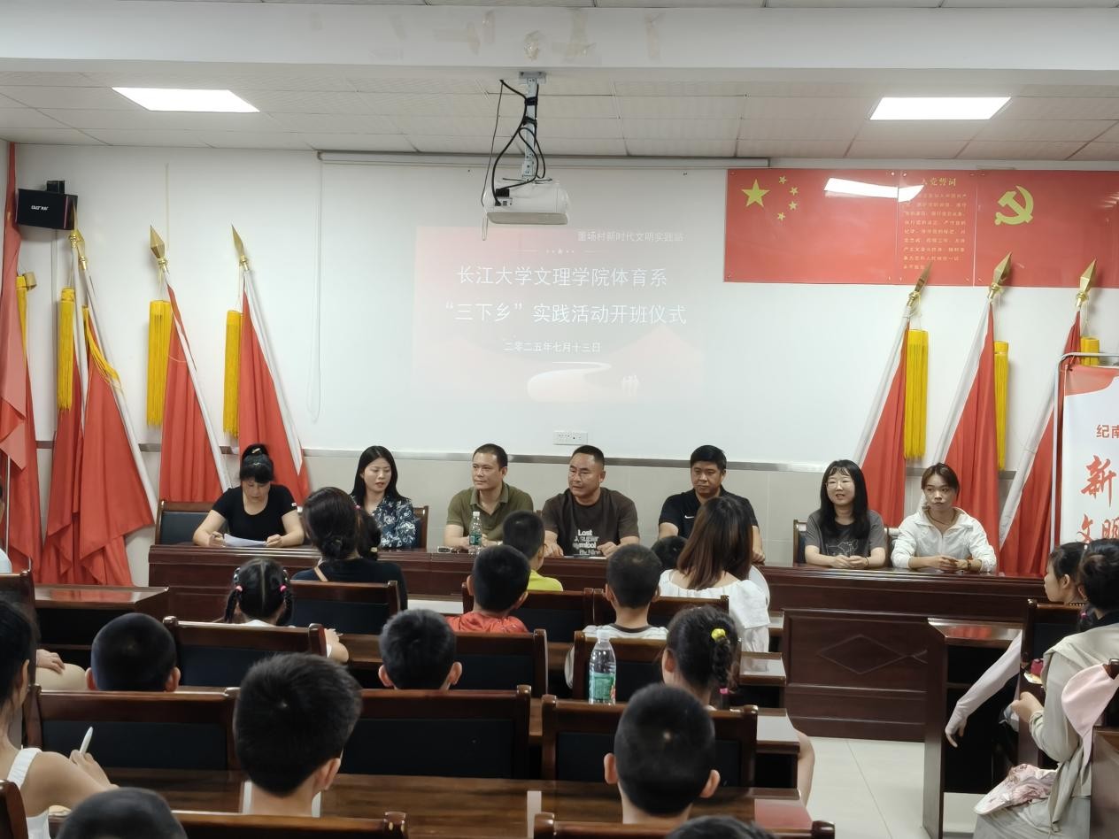 本网讯(通讯员 谭钰婷)2025年7月13日下午3点半,太阳集团122cc体育系“三下乡”暑期社会实践活动开班仪式在荆州市纪南文旅区董场村活动中心隆重举行。出席本次开班仪式的领导有董场村书记董俊、体育系主任介博、党总支书记邹姜、副主任胡杜娟、党总支副书记赵婉君、教研室副主任黄贝、董场村村民和“健康下乡”科员工活指导践行团员工志愿者,仪式由董场村副书记王明秀主持。