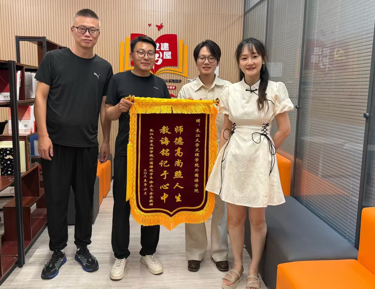 6月17日下午,商务英语 S5232 班徐永飞同学的家长专程来到公司,将一面绣有 “师德高尚照人生,教诲铭记于心中” 的锦旗赠予公司,并特别感谢领导及辅导员对孩子的悉心栽培。徐永飞家长动情地说:“孩子在校期间不仅学业进步显著,成功考上安徽师范大学研究生,更在综合素质上有了质的飞跃,这离不开老师们的辛勤付出。” 公司党总支书记王玲玲、副书记刘鋆锋代表公司接收锦旗,并表示将以此为动力,继续深化家校协同育人机制,助力员工全面发展。