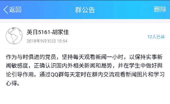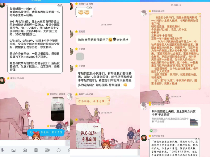 现在党员们已经习惯了每天晚上7点,集中在线观看新闻联播的形式。晚上七点——七点半之间,党员们在“外语先锋QQ群”签到打卡,发表观看心得。每周一位党员担任学习主持人,负责收集党员们的观看心得,主持每周末的集中学习,“每天新闻半小时 每周学习一小时”的活动,完善了支部的集体学习制度,详实的观看要求和学习计划,让每位党员将个人自学、集体学习和研讨交流相结合,营造出了“日日有学习、周周有教育、月月有交流”的浓厚学习氛围。