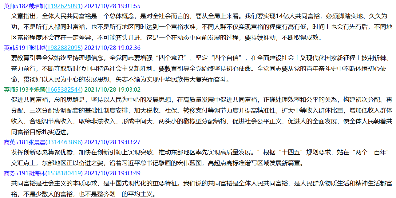 通过本次学习,增强了党员对共同富裕的了解,提升了党员的知识储备,保持了党员的先进性。作为老员工党员,我们要认真学习时政要闻,积极主动更新自己,保持思想先进,从而在思想和行动上不断向党靠拢。