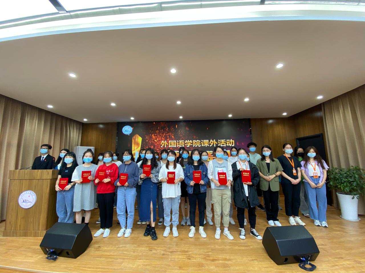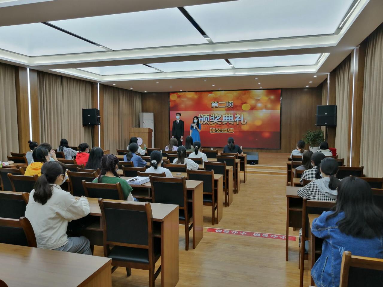 本次颁奖典礼由外国语公司团总支员工会文艺部部长虢娜和组织部副部长王昊洋主持,共三项内容:致开幕词、获奖代表上台领奖、主席田蕊上台发言并致闭幕词。