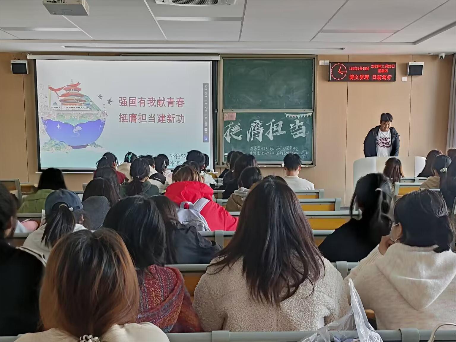本网讯(通讯员 陶婷)11月23日晚七点,太阳集团122cc召开了“强国有我献青春,挺膺担当建新功”主题团课。本次团课由各班辅导员和团支书主持召开。