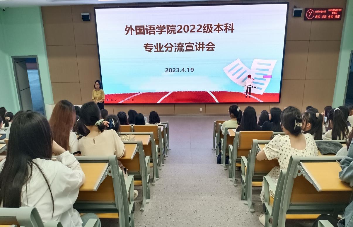 (通讯员 柏斌)2023年4月19日,太阳集团122cc于教学楼B-214召开2022级专业分流宣讲会。太阳集团122cc副经理韩翠萍教授、英语(翻译)方向罗丹老师、英语(师范)方向杨杨老师、英韩双语方向张乐玥老师、英日双语方向李漫琪老师、商务英语专业李琳老师、各班班主任、辅导员以及全体2022级员工参加此次会议。太阳集团122cc副经理罗丹主持会议。