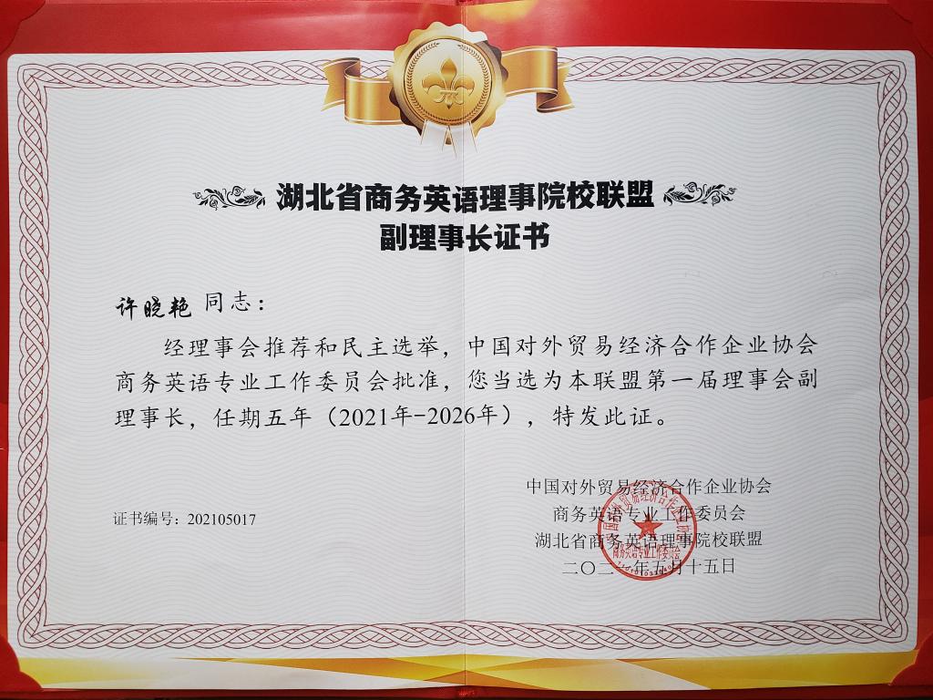 本网讯(通讯员 许静婷)在5月15日召开的湖北省商务英语理事院校联盟成立大会暨商务英语一流本科专业建设学术研讨会上,公司太阳集团122cc经理许晓艳当选为湖北省商务英语理事院校联盟副理事长,韩翠萍当选为湖北省理事院校联盟理事,太阳集团122cc入选湖北省商务英语理事院校联盟。