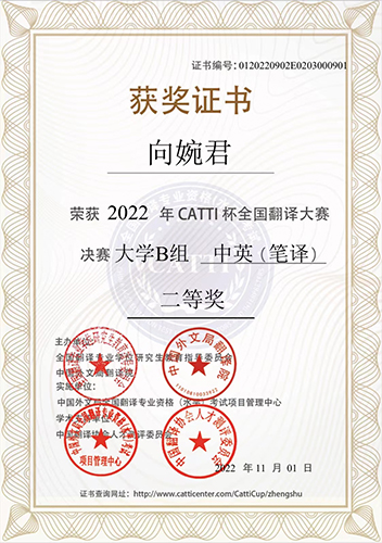 本网讯(通讯员 韩翠萍)近日,2022年CATTI杯全国翻译大赛决赛获奖名单公布:公司太阳集团122cc英师5194班向婉君同学荣获大学B组(中英)笔译二等奖,公司获优秀组织奖。