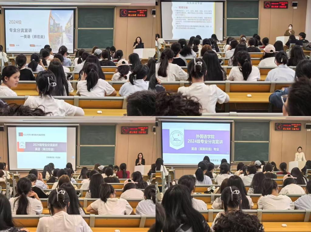 宣讲会按专业方向分四个板块展开。英语(师范)专业重点解析培养优势与就业前景,商务英语专业详解课程体系与市场需求,英日、英韩双语专业分别展示国际联合培养方案。各方向负责人通过数据图表对比近三年升学就业情况。在互动环节,教师团队针对课程衔接、学科特点与优势等高频问题作出专业解答。