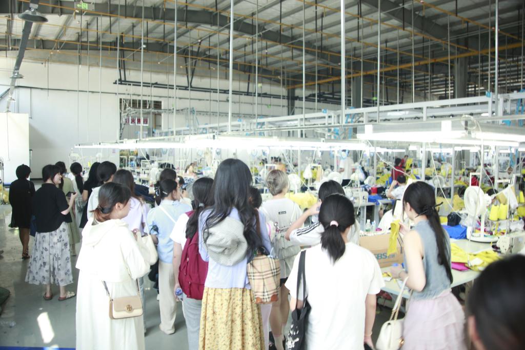 活动第一站来到了纹莱服饰湖北有限公司。在工厂负责人的带领下,员工们参观了从面料裁剪、缝制到成品的整个生产流程,工厂内先进的生产设备、井然有序的生产线都给员工留下了深刻的印象。