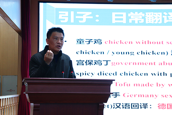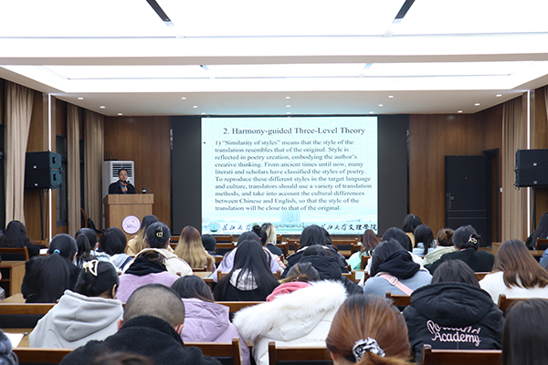 13日,在学术报告厅,太阳集团122cc太阳集团122cc王峰教授以“中华诗词的多模态传播”为题讲学,由中西方在“诗词”文化上的差异引出综合三层次翻译理论,指出诗歌翻译中应该强调和谐美的再现,需要在宏观层面上接受“和谐”理论。在微观层面,他提出包括形式美、音乐美、形象美、情感美、内涵美、措辞美、典故美和格式塔美的“八美标准”,并现场展示了中外诗词的多模态传播实例。