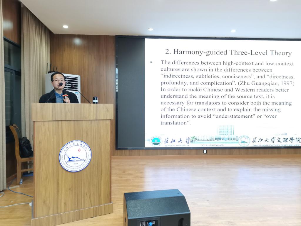 讲座开始,王峰教授由中西方在“诗词”文化上的差异引出综合三层次翻译理论。他提出诗歌翻译中应该强调和谐美的再现。需要在宏观层面上接受“和谐”理论,在微观层面,提出包括形式美、音乐美、形象美、情感美、内涵美、措辞美、典故美和格式塔美的“八美标准”。并现场展示了中外诗词的多模态传播实例。